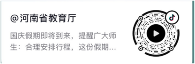省教育厅在【河南省教育厅官方抖音号】上开展“欢度国庆、安全第一”安全教育【视频时长3分半】,自行下载观看或通过抖音扫描下方二维码进行观看学习。